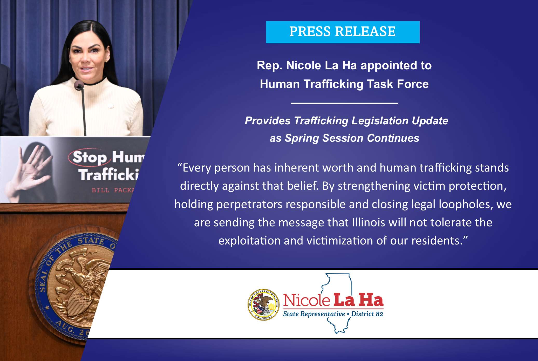 Provides Trafficking Legislation Update as Spring Session Continues State Representative Nicole La Ha announced she was appointed to the Illinois Human Trafficking Task Force by Illinois House Minority Leader Tony…