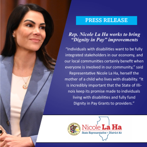 “Individuals with disabilities want to be fully integrated stakeholders in our economy, and our local communities certainly benefit when everyone is involved in our community,” said Representative Nicole La Ha, herself the mother of a child who lives with disability. “It is incredibly important that the State of Illinois keep its promise made to individuals living with disabilities and fully fund Dignity in Pay Grants to providers.”